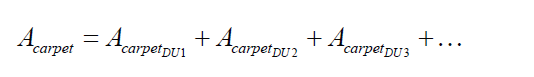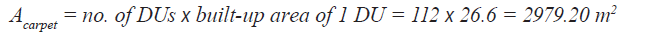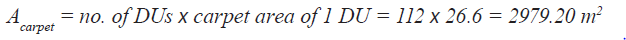 Acarpet: carpet area of dwelling units (m2); it is the net usable floor area of a dwelling unit, excluding the area covered by the external walls, areas under services shafts, exclusive balcony or verandah area and exclusive open terrace area, but includes the area covered by the internal partition walls of the dwelling unit.