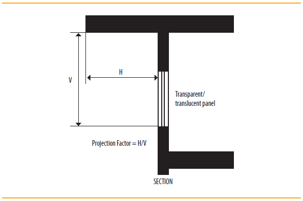 Projection Factor, Overhang: Projection factor (overhang) is the ratio of the horizontal depth of the external shading projection to the sum of the height of a non-opaque component and the distance from the top of the same component to the bottom of the farthest point of the external shading projection, in consistent units (Figure 2).