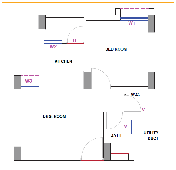 Building Envelope: The elements of a building that separate the habitable spaces of dwelling units from the exterior and are exposed to the ambient (i.e., exposed directly to external air and opening into balconies). It does not include walls facing open corridors and enclosed shafts, as well as walls of common services such as lifts and staircase. (See Figure 1. Dotted lines show the walls included in the definition of building envelope in this code.)